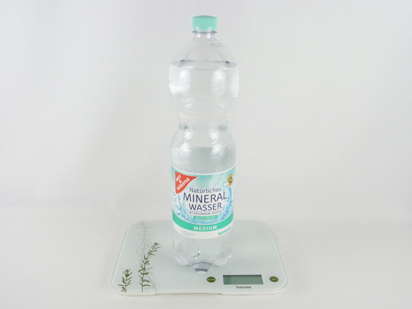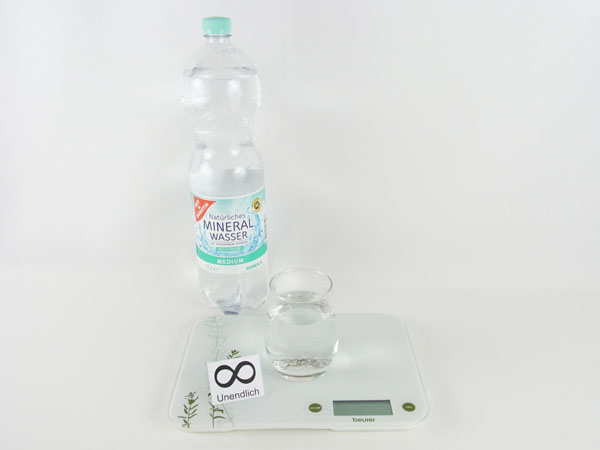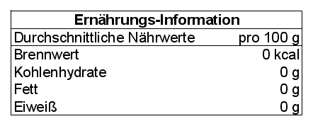 Kalorien: 1 Flasche = 1500 g = 0 kcal 1 Glas = 200 g = 0 kcal Wieviel sind 100 kcal: 100 kcal = ? g - Hat keine Kalorien.